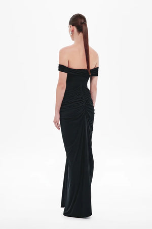 The Polaris strapless dress is a standout cocktail style, rouched maxi length, crafted in a soft cupro midweight fabrication.