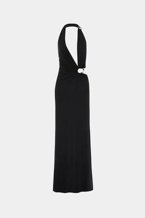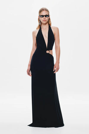 A buttery cupro dress with asymmetric plunge neckline. Accented by metal ring hardware at the midriff creating delicate gathers. The garment boasts an exposed open-back finished with a refined metal ring closure.