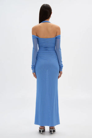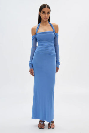 The 'Sonnet' Mesh Maxi Dress in Cornflower Blue, sleek simplicity with elevated detailing. 'Sonnet' features a halter neck design that loops around the arm. The light weight fabrication keeps the style breathable, while offering comfort. 'Sonnet'; offers a body-con silhouette.