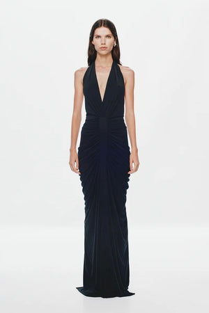 A plunging neckline dress crafted from cupro jersey. The fabrication is ruched up the front and back of the garment, creating delicate drapery. The garment is finished with a halter neck.