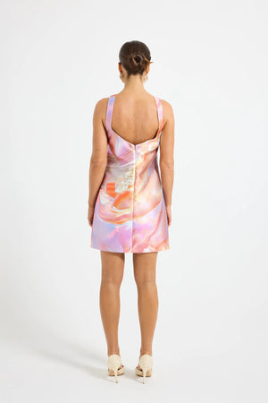 The Siren Shift Dress by PASDUCHAS is crafted from structured taffeta featuring an exclusive organic pearlescent print. Minimal yet striking, this piece showcases a modern racer-style neckline and a low, rounded cut-away back that reveals just the right amount of skin. Cut to a mini length, the silhouette sits cleanly off the body for a fresh, youthful feel. A concealed centre-back zipper allows for ease of fit and comfort of wear. Fully lined throughout, this is a contemporary option perfect for long lunches, parties, or resort evenings.