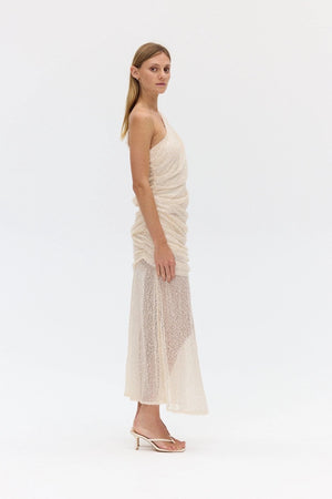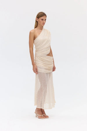 The Nightfall Sequin Maxi Dress is defined by its directional lines and sequinned finish. Cut to a fitted silhouette, its one-shoulder design is softly tucked at the bodice and side seams to create a sculptural effect. A concealed elastic waistband and invisible side zip ensure a seamless fit, while the flared skirt brings a dynamic finish to this elegant piece.