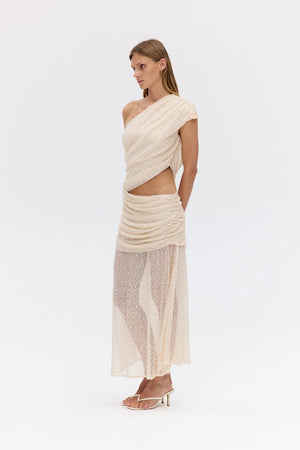 - One-shoulder cut-out maxi with tucked asymmetric bodice and cap sleeves
