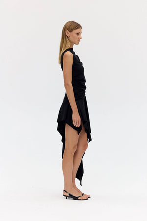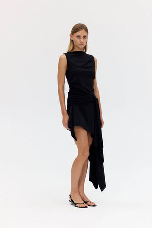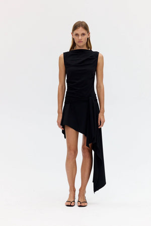The Nova Tank Dress is cut to a slim silhouette through the bodice, contrasted by an asymmetric draped skirt that falls with ease. Tucks through the armhole and waist create soft folds and texture, while an attached waist tie draws in shape. A wide neckline frames the look, bringing balance to the directional lines of the skirt.