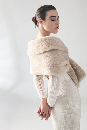 THE CHAMPAGNE WRAP ADDS TIMELESS AND ETHICAL STYLE TO THE CELEBRATION WITH ULTRA-SOFT SHORT LENGTH FAUX FUR AND A COZY OVERSIZED FIT AROUND THE SHOULDERS AND ARMS.