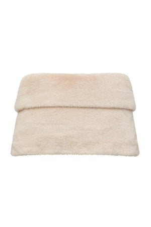 THE CHAMPAGNE WRAP IS CONSTRUCTED WITH PLUSH SHORT LENGTH FAUX FUR AND FEATURES A SNAP HOOK AND EYELET FOR CLOSURE IN THE FRONT.