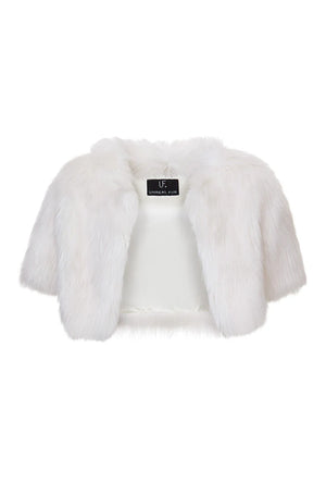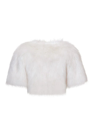 THE LOVE A FUR BOLERO FEATURES SHORT SLEEVES, A HIGH CROPPED SILHOUETTE, AND AN OPEN FRONT.