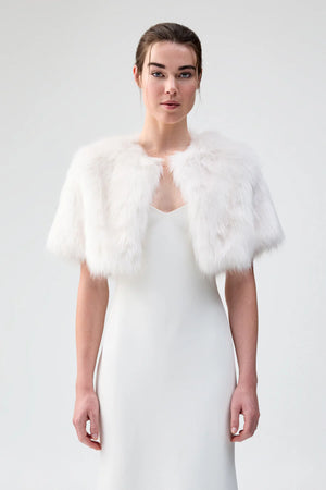OUR LOVE A FUR BOLERO LAYERS BEAUTIFULLY OVER THE SHOULDERS AND PROVIDES A LUXE TOUCH OF COZY GLAMOUR FOR THE PARTY AFTER THE CEREMONY.