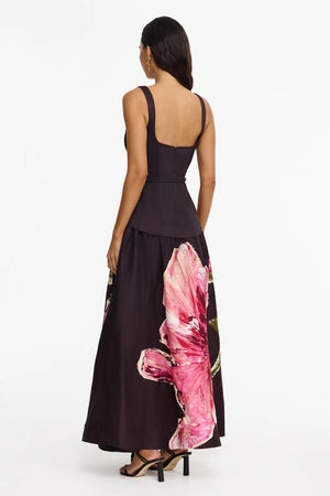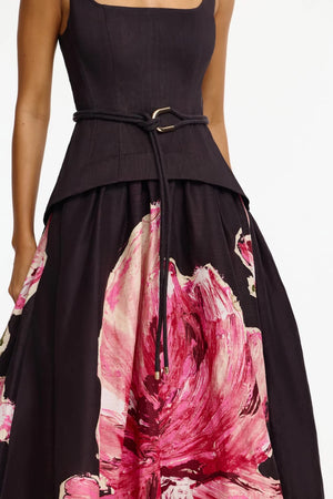 The Actonhill Maxi Dress in Garnet Magnolia is a sculptural statement for modern event dressing. Defined by its square neckline and fitted bodice, this sleeveless silhouette features a refined peplum waist and a detachable adjustable belt with gold hardware, bringing a sense of structure to the lightweight linen blend. Featuring an exclusive floral print, this dress is the perfect choice for garden events and formal soirees alike.