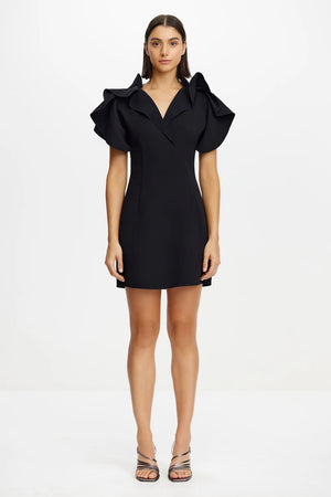 Introducing the Normanhill Mini Dress in Black, a contemporary silhouette encompasing unique tailoring. Featuring dramatic sculptural sleeve details and a fitted bodice, this dress offers a flattering, structured shape. The invisible center-back zipper ensures a seamless fit that hugs the waist. Perfect for cocktail parties or special dinner affairs.