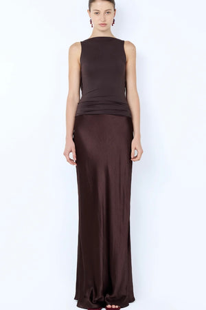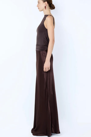 A brown maxi dress featuring a stretch-jersey bodice with a boat neckline and low cowl back. An elegant choice for formal occasions and evening events.