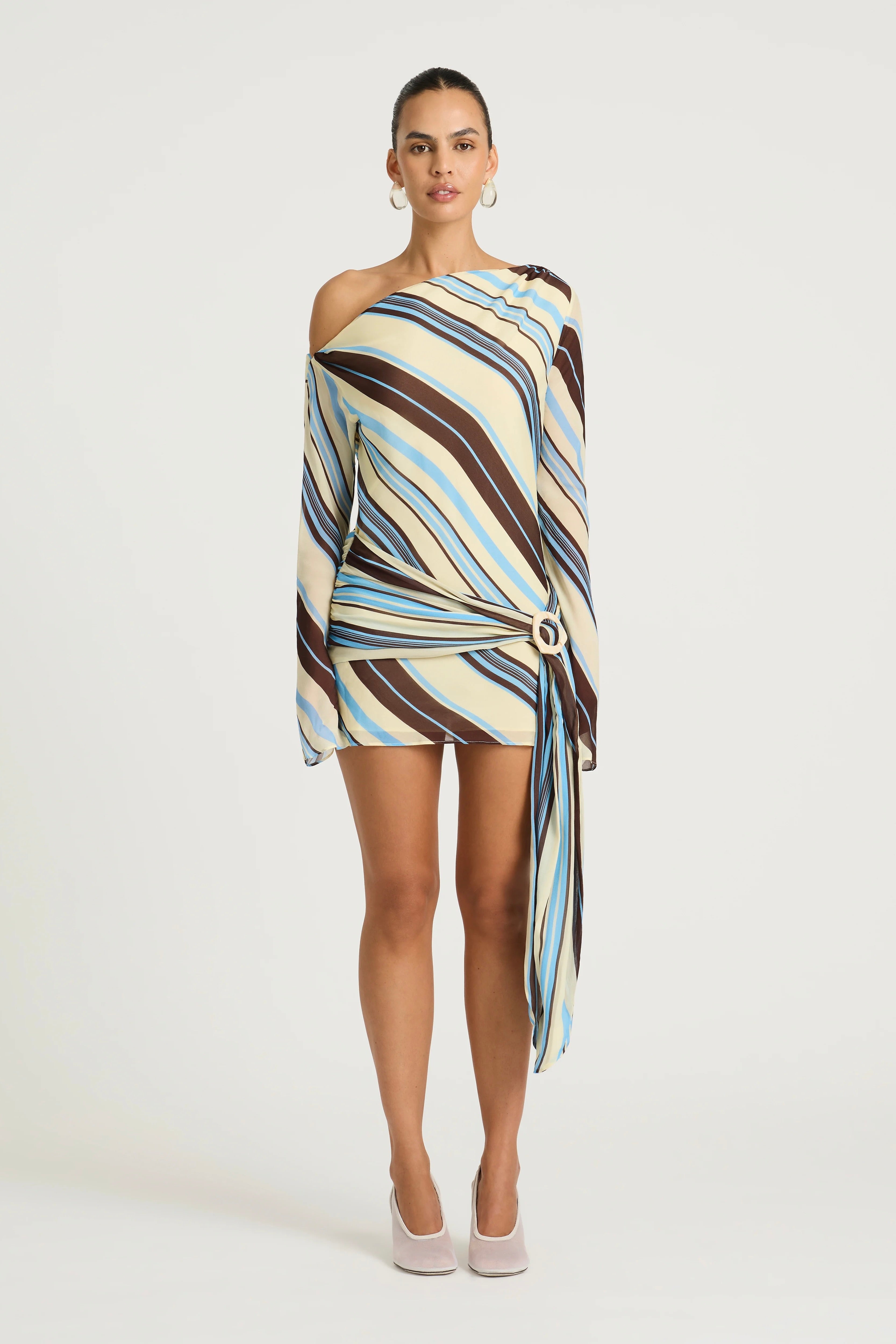 The Elise Mini Dress features a flowing one-shoulder silhouette with a long, flared sleeve. The layered mini skirt is finished with a sash detail at the hip, accented by a statement buckle for dimension.