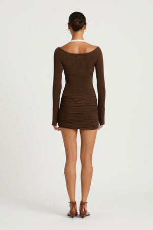 The Enora Mini Dress is crafted from a stretch ribbed fabrication and features a contrast halter neckline detail. It has a wide shoulder neckline, ruched skirt detail and long sleeves with thumb holes.