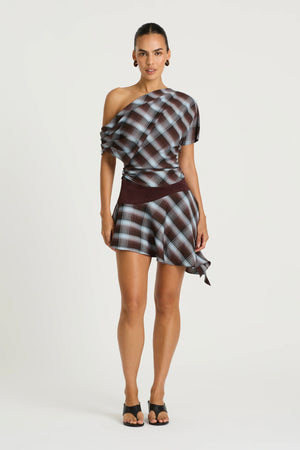 The Faye Mini Dress features an off-shoulder design with draped back detail. The skirt drapes softly from the asymmetric PU Suede belt panel. An invisible side-zip ensures a clean finish.