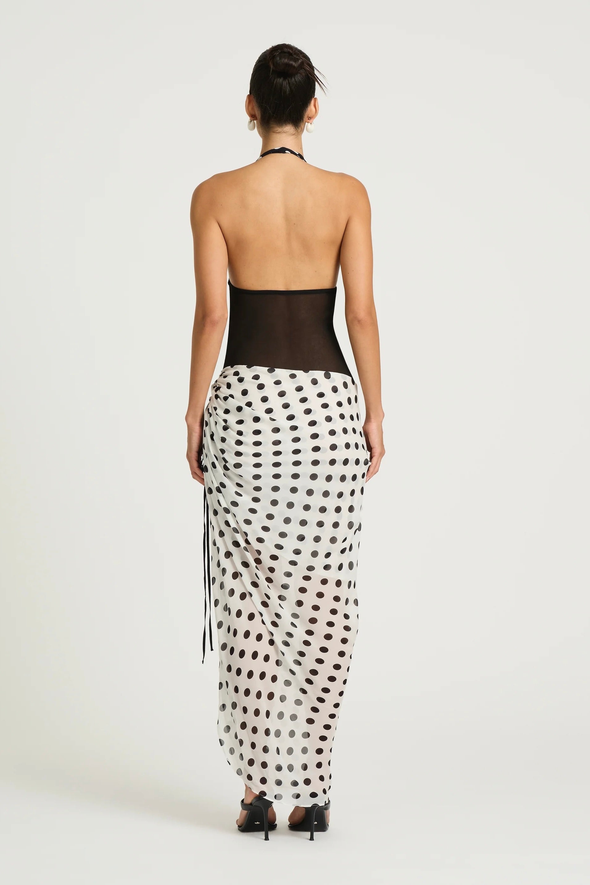 The Marnie Maxi Dress features a deep plunge neckline with halter straps and a floor-length silhouette. Designed with adjustable ruching on the side, allowing you to customise the length and leg opening for a flattering, versatile fit.