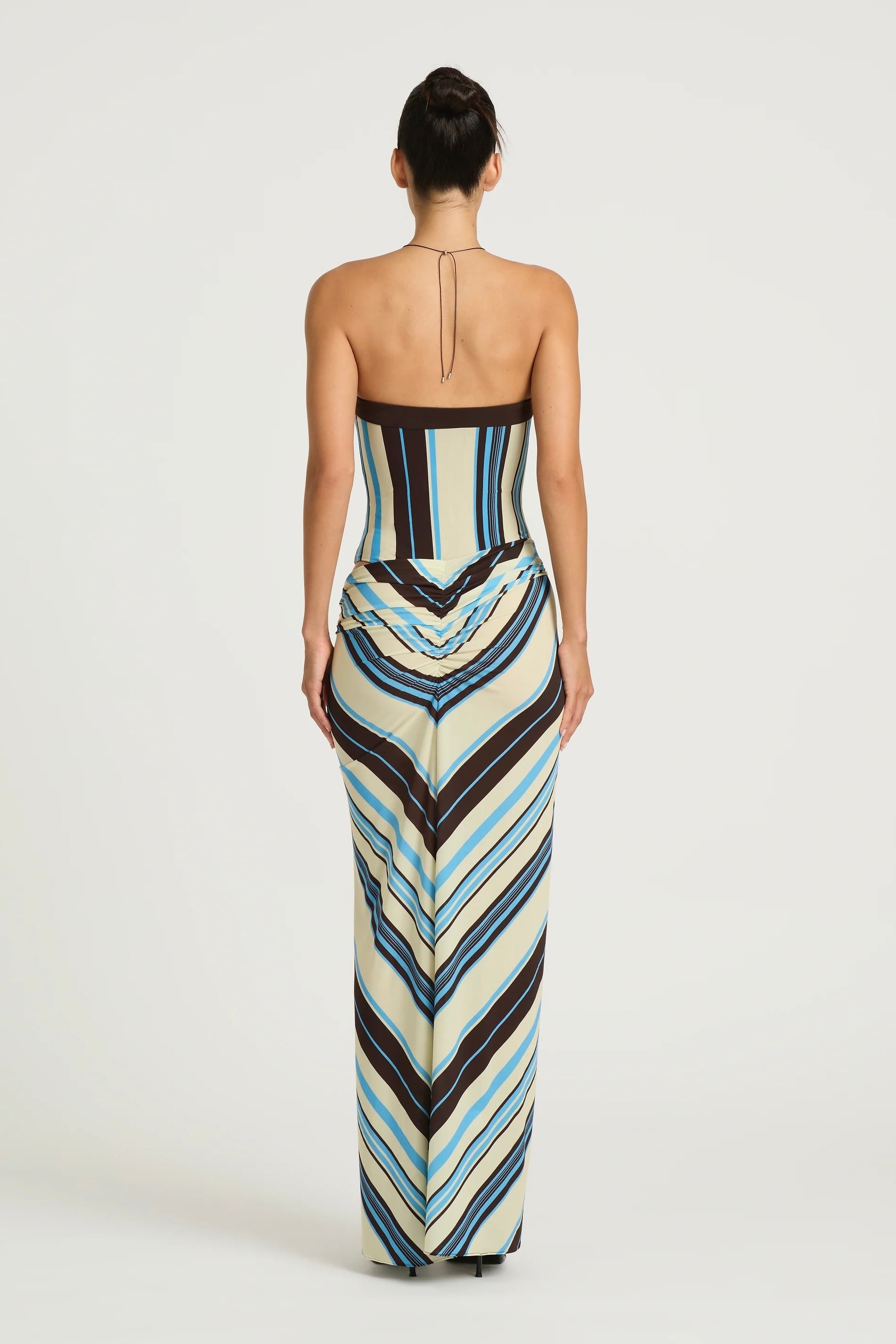 The Rumi Maxi Dress features an asymmetric one-shoulder neckline crafted from stretchy jersey fabric. The skirt follows an asymmetric design with a curved gathered detail and a front leg opening for movement.