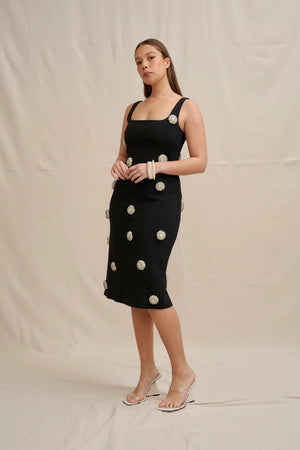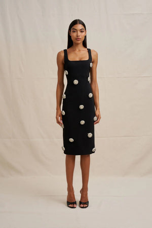 Hand sewn 3D pearl beaded clusters are scattered on the front and back of the dress.