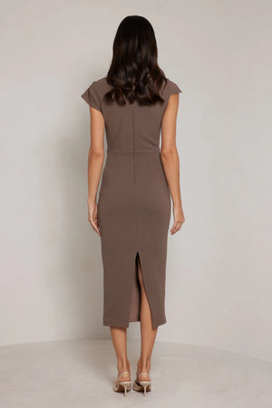 Introducing our elegant Milani, a perfect blend of sophistication and comfort. This stunning piece features a high neckline and cap sleeves, offering a sleek and modern silhouette. The dress is crafted from a thick, stretchy fabric that hugs the body beautifully.