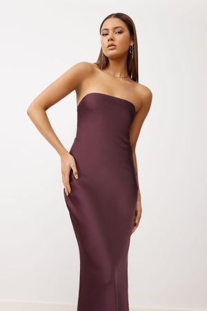The Indra is an elegant ankle length dress, featuring a strapless neckline and simple straight silhouette. The back features a horizontal band, allowing the wear of a bra, and a low beautifully draped cowl. Perfected simplicity.
