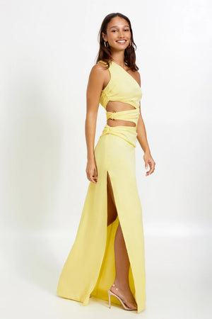 The Isabel Dress features an asymmetric bodice design with sexy cut-outs that accentuate the waist. It is cut from a delicate georgette which gathers beautifully and drapes into a long flowing skirt with a thigh high split. The bodice features a gold bar with ball ends at the shoulder and waist panels.