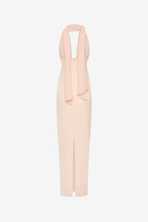 The Capezza Silk Dress pairs a lustrous silk upper with a fitted, light bonded crepe, midi length skirt. The plunging halter neckline features a versatile wrap design that can be draped in multiple ways.