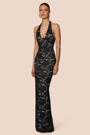 Turn heads in the Alessia Gown, a sultry silhouette cut from delicate stretch lace. Designed with a plunging halter neckline, underwire feature and boned under bodice for incredible fit. This gown is both romantic and daring. Fully lined with a skin tone power mesh, it finishes with CB zip closure for a seamless look.