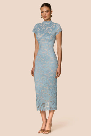Refined elegance meets contemporary charm. The Alessia Midi in stretch lace is cut close to the body with flattering and supportive design lines, featuring a high neckline, cap sleeves, and a stunning scalloped hem. Rounded chic and subtle shoulder pad and fully lined in skin tone power mesh.