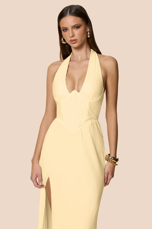 Simply stunning halter style gown with structured bodice for a snatched silhouette. Thigh high split, long ties at back neck and invisible zip closure at back. Made from our popular pleated fabrication, fully lined.