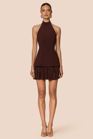 Flirtatious and fresh. The Darling Mini combines clean lines with a soft pleated hem for playful movement. A bonded crepe halter bodice with side boning and pleated mini. Back neck closure with covered buttons and CB logo zipper.