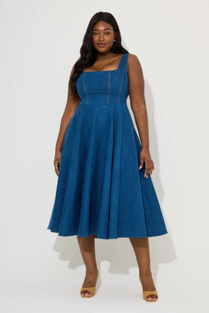 Odd Muse Cotton Mix Denim Square Neck Midi- Light Blue