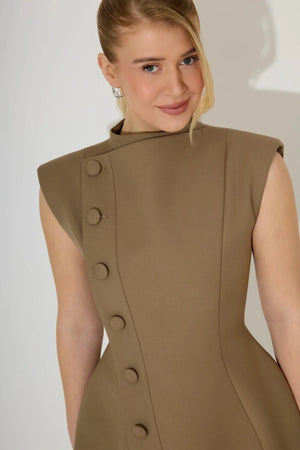 Introducing the Sleeveless Button Detail Mini Dress in Khaki — a tailored mini crafted with the brand’s signature cinched waist and flattering dart detailing. Finished with statement buttons and a discreet zip, it's a sophisticated choice for year-round occasions.