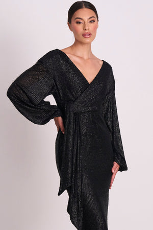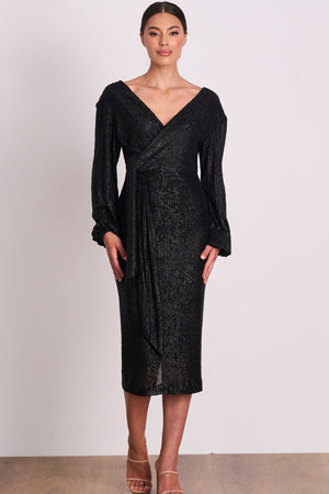 The Bijou Midi by PASDUCHAS is made from matte sequin on knit backing. A mock wrap shape at it's core, the look is modern and sleek featuring a V-neckline and is anchored at the waist enhanced by a side tie. Long blouson style sleeves balance the look in this streamlined winter option.