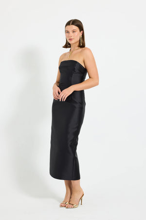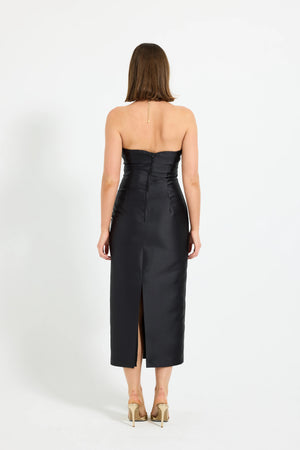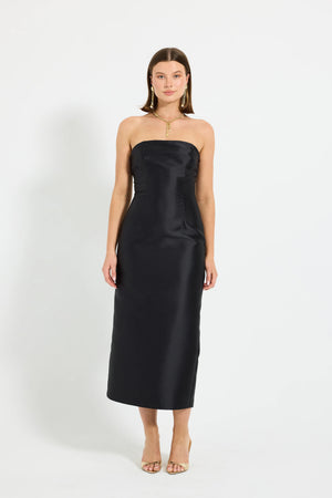 by PASDUCHAS is crafted from lustrous taffeta. This statement piece features a clean, strapless neckline and a fitted bodice, internally supported with boning. Designed to flatter, the silhouette skims the body and falls to a midi-length hem. A centre-back split adds ease of movement, while a concealed centre-back zipper ensures comfort and ease of fit. Fully lined throughout, this is an elevated option for modern event dressing.