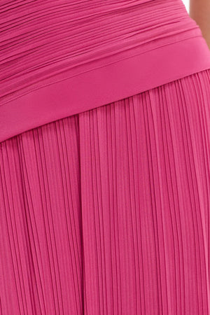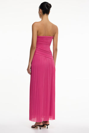 The Nesta Maxi Dress in Berry showcases a sculpted strapless silhouette, defined by intricate pleating in a deep pink palette. Strategically placed ruching contours the fitted bodice, while an angled hem and floor-length design provide refined movement. The perfect style for wedding guest dressing andgarden parties alike.