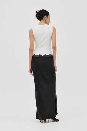 The Echo Contrast Tank Dress is defined by a fitted tank bodice in ribbed jersey, balanced with a sheer lace panel that softly traces the waist. Falling into a bias-cut cupro skirt, the silhouette elongates to a floor length with natural movement. A refined silhouette that still feels easy and wearable.