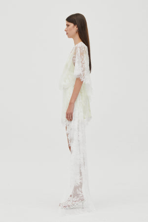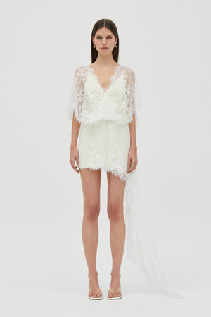 The Poetry Draped Lace Dress is defined by a hand-draped lace overlay that floats softly over the body, creating lightness and movement through the silhouette. A deep V neckline is framed by cape-style lace sleeves, while the panelled bodice offers a refined, slim fit beneath the sheer layer. Finished with an asymmetric lace train and a low V-back, the look balances delicacy with a refined softness.