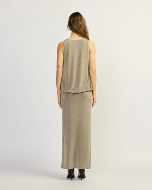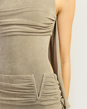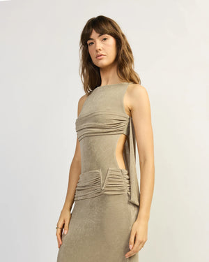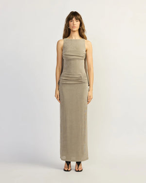The Samson Dress is a refined maxi silhouette designed in a soft textured stretch fabrication that gently skims the body. Featuring a clean high neckline and elongated shape, the design is elevated by sculpted ruching through the bodice and hip with wire v cut out. A softly draped back panel adds fluid dimension, while the streamlined column skirt keeps the look modern and composed.